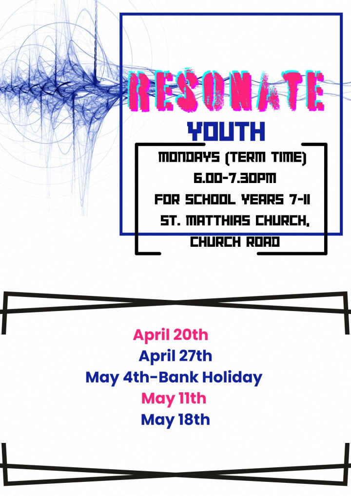 The Resonate Youth Group for young people in school years 7-11 is held in term time at St Matthias’ Church, Church Road on Mondays between 6pm and 7.30pm.
